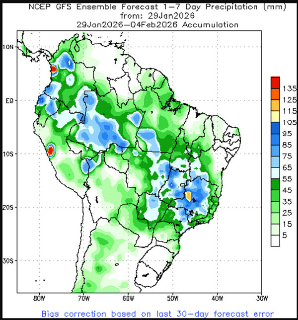 Above: Brazil and Argentina one-week forecast total precipitation courtesy of the National Weather Service, Climate Prediction Center