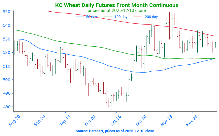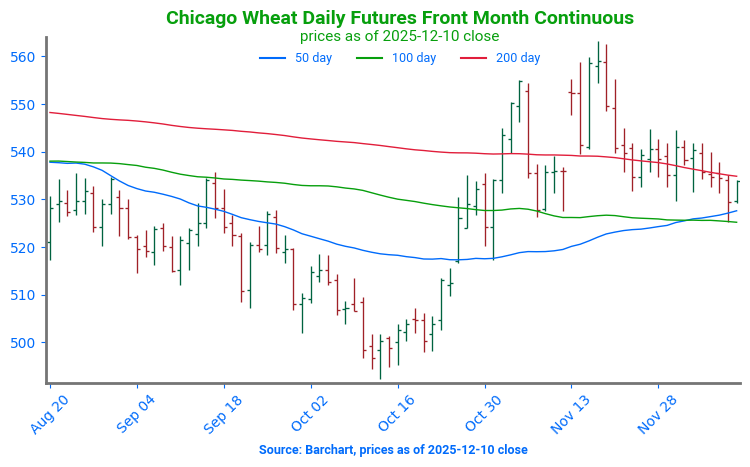 Chicago Wheat Tests Support: Wheat futures have started to retest technical support at the 200-day moving average, near 534. Should this support break, a secondary point of support can be found at a band of moving averages near 525. Resistance can be found at the most recent high, near 561.