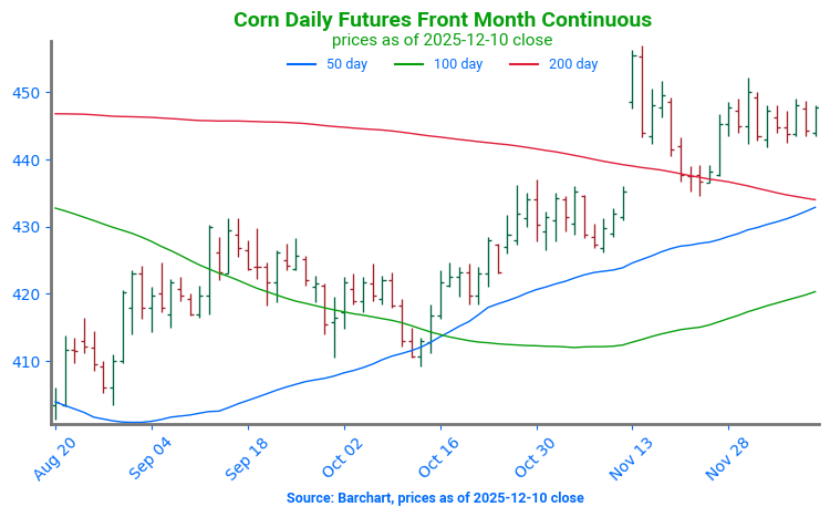 - Corn futures are trading higher to start the day but remain within their 5-cent trading range. December corn is up 4-1/4 cents to $4.39 and expires tomorrow while March corn is up 3 cents to $4.47-1/4.
