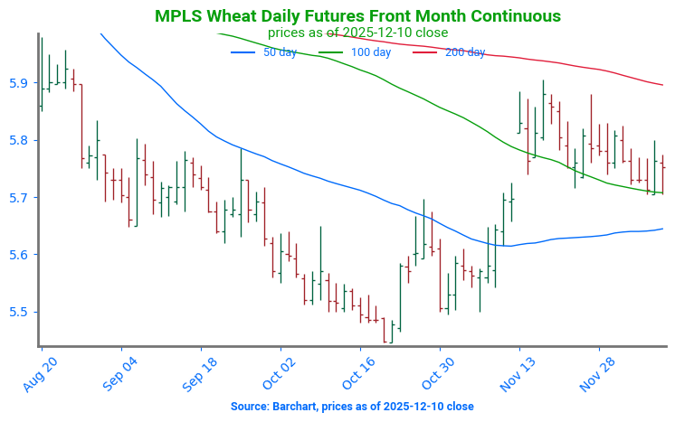 Spring Wheat Consolidates Spring wheat futures have started a consolidation phase after contract rollover propelled prices above the 100-day moving average. The 100-day moving average now serves as support, near 571. Resistance can be found at the 200-day moving average, near 590.