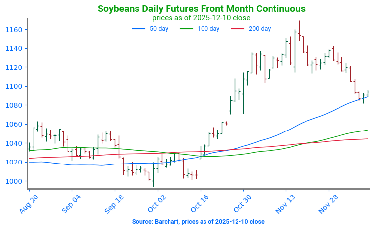 Soybeans Break Lower, Test Support: Soybean futures broke below key psychological support at 1100, and have now started to test technical support at the 50-day moving average, near 1083. A secondary point of support can be found at the 100-day moving average, near 1051. The 1100 psychological level will now serve as key technical resistance.