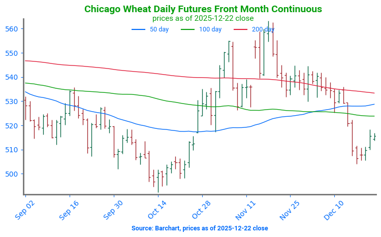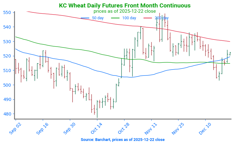 Chicago Wheat Break Lower: Wheat futures broke below a band of moving averages after spending significant time testing support at the 200-day moving average. The first point of technical support can be found at the October 14 low, near 492. Technical resistance can now be found at the 100-day moving average, near 524.