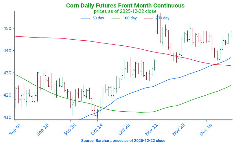- Corn futures are trading higher and have broken above the 200-day moving average. March corn is up 1-1/4 cent to $4.48-1/4 while May is up 1-1/2 cents to $4.56. Good export sales have been supportive.