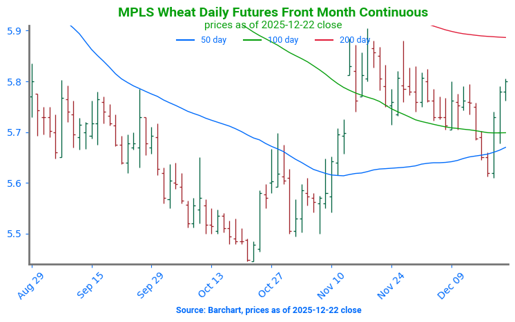 Spring Wheat Slips Lower: Spring wheat futures broke below the 50 and 100 day moving averages following the recent consolidation phase. Technical support can be found near 550. The 50-day moving average now serves as technical resistance, near 565.