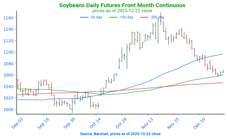 - Bloomberg reports China has purchased about 6 mmt of soybeans, roughly half of its 12 mmt commitment. They bought another 134,000 mt on Friday. While meeting the full target by year-end appears unlikely, the current pace suggests the commitment could be completed by the end of the marketing year, or sooner.