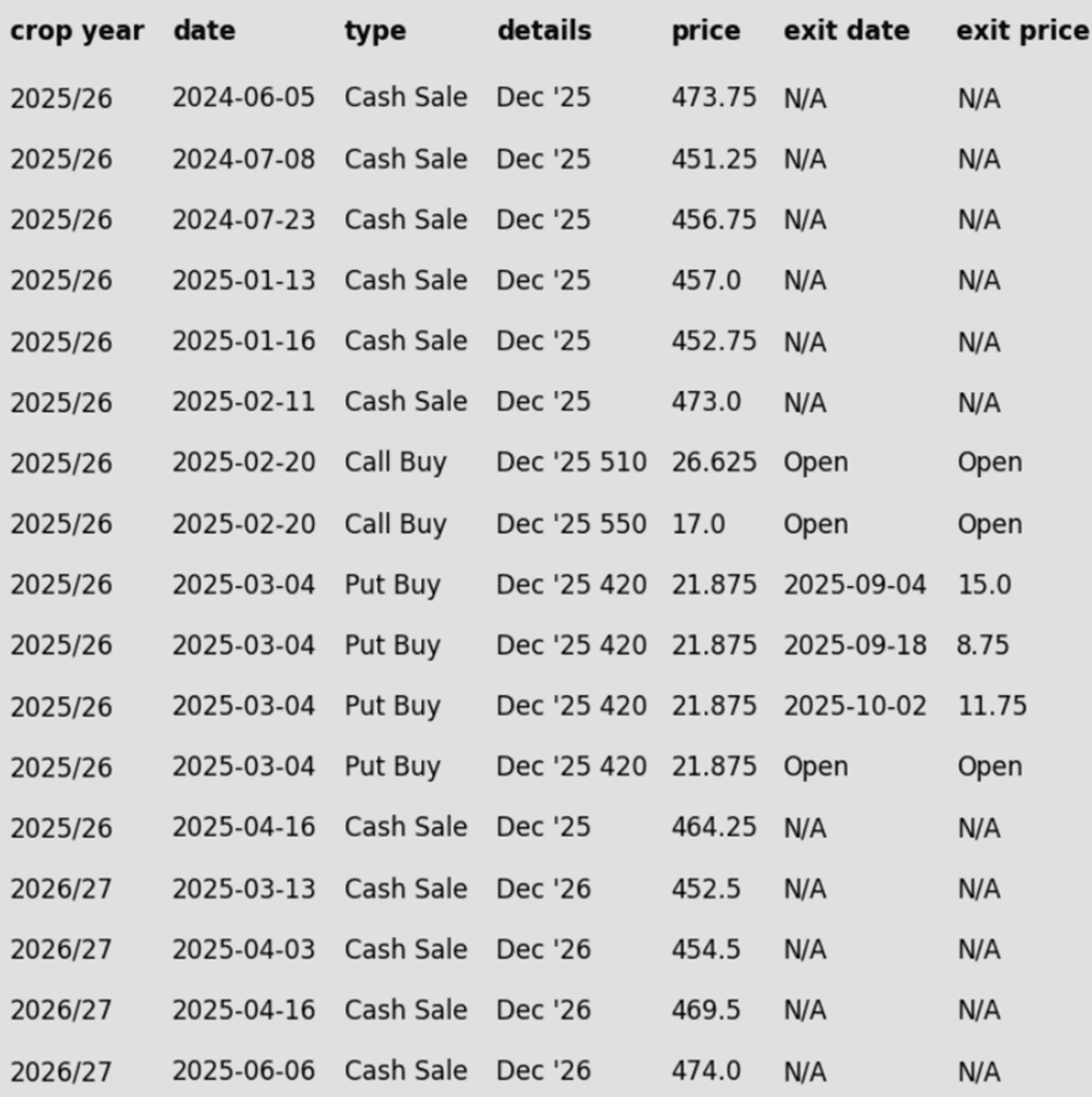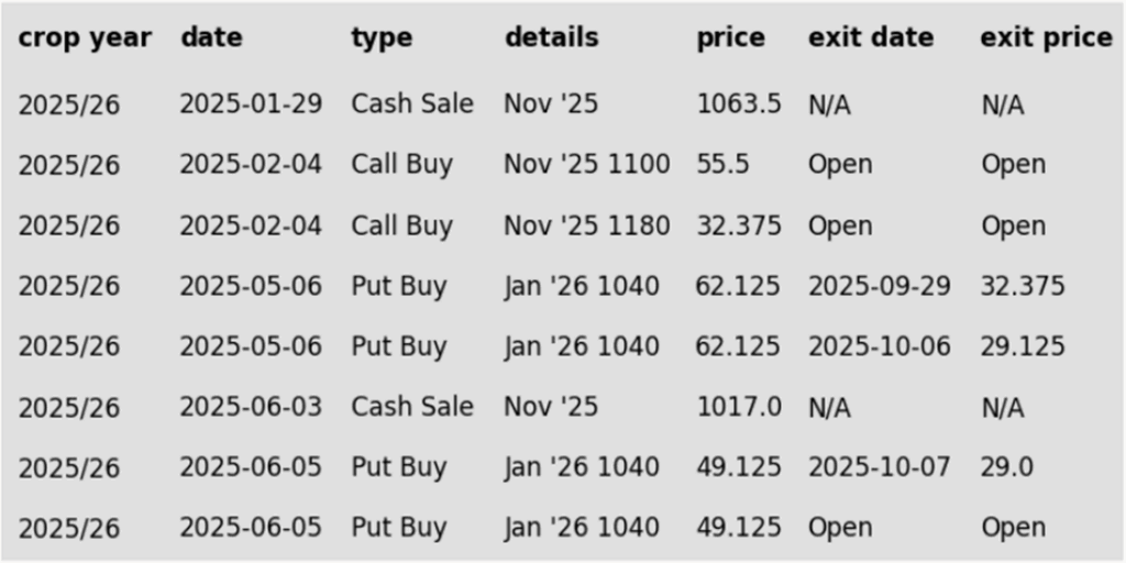 - Sell the first portion of your crop if November 2026 futures break below 1045.