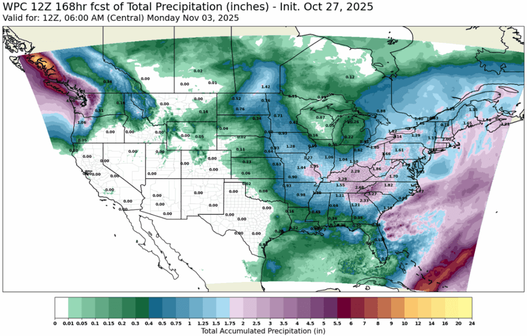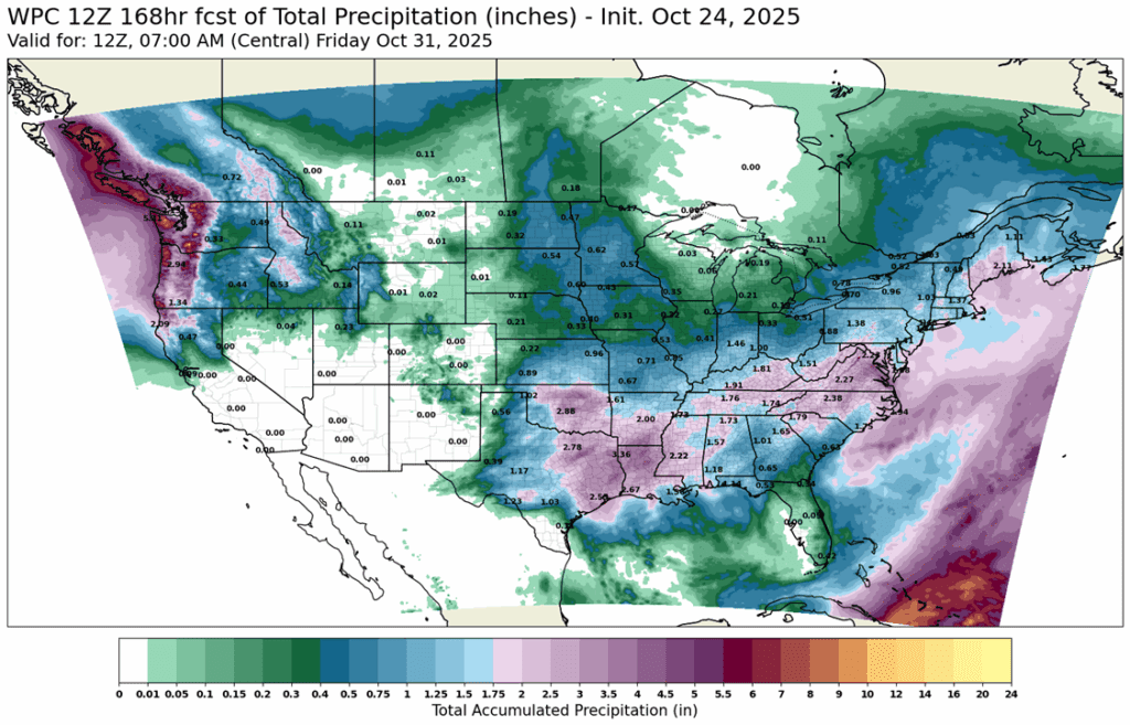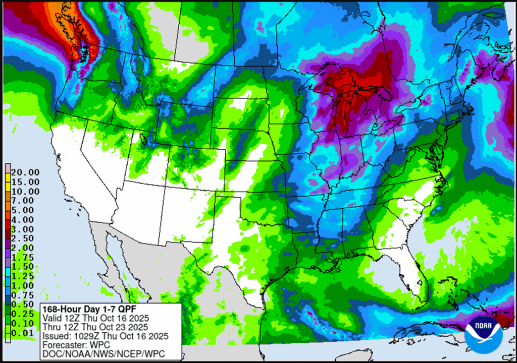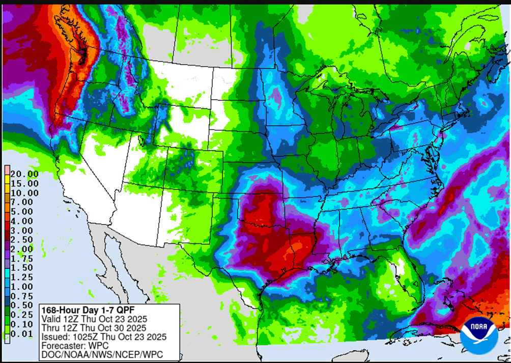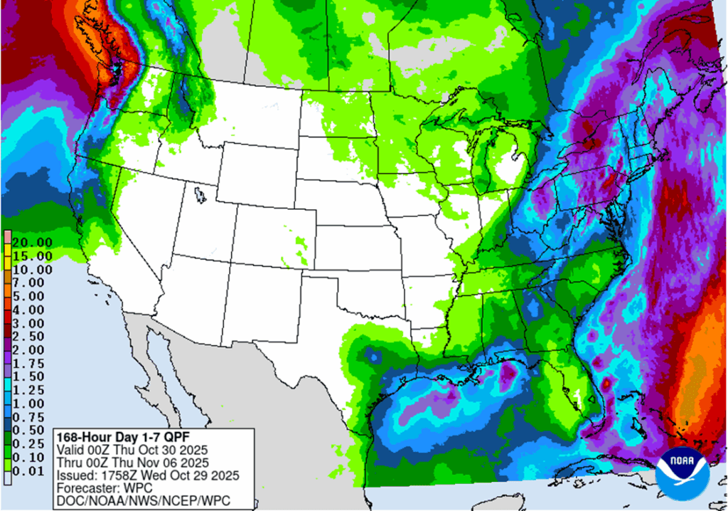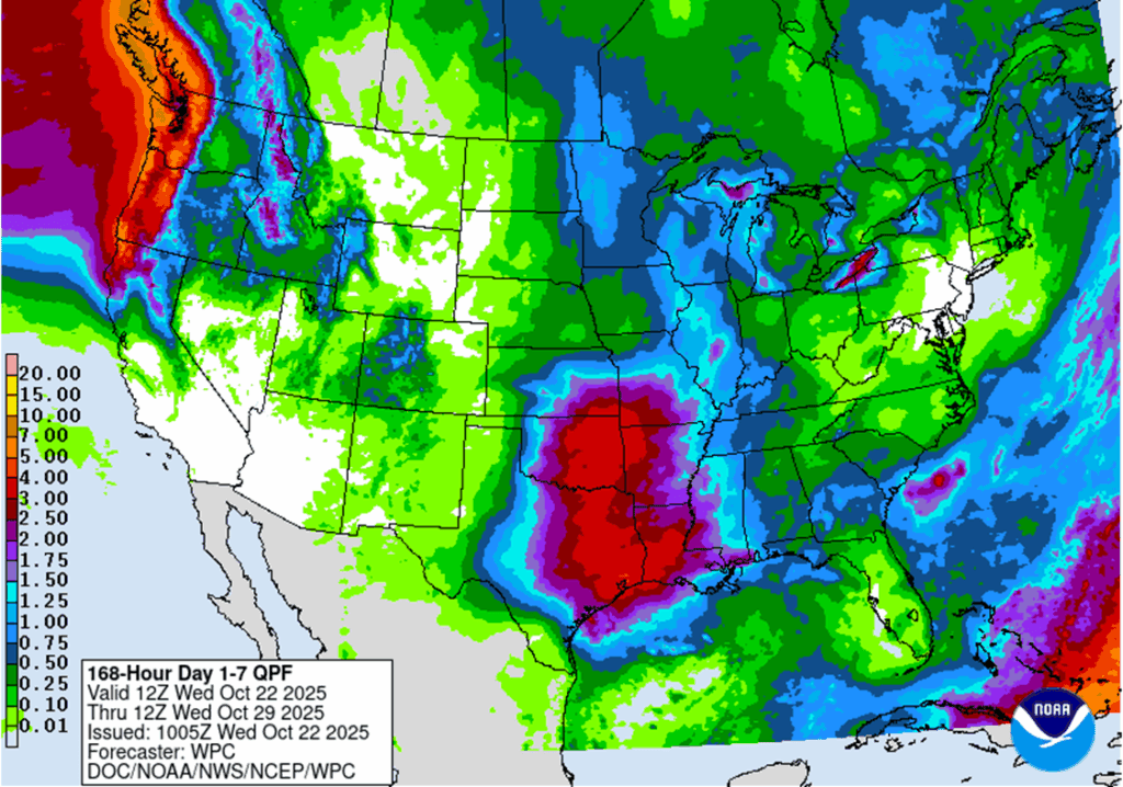 - 🌱 Soybeans: Soybean futures ended mixed Wednesday following two weeks of strong gains totaling 60 cents. The market paused ahead of the highly anticipated meeting between President Trump and China’s President Xi.