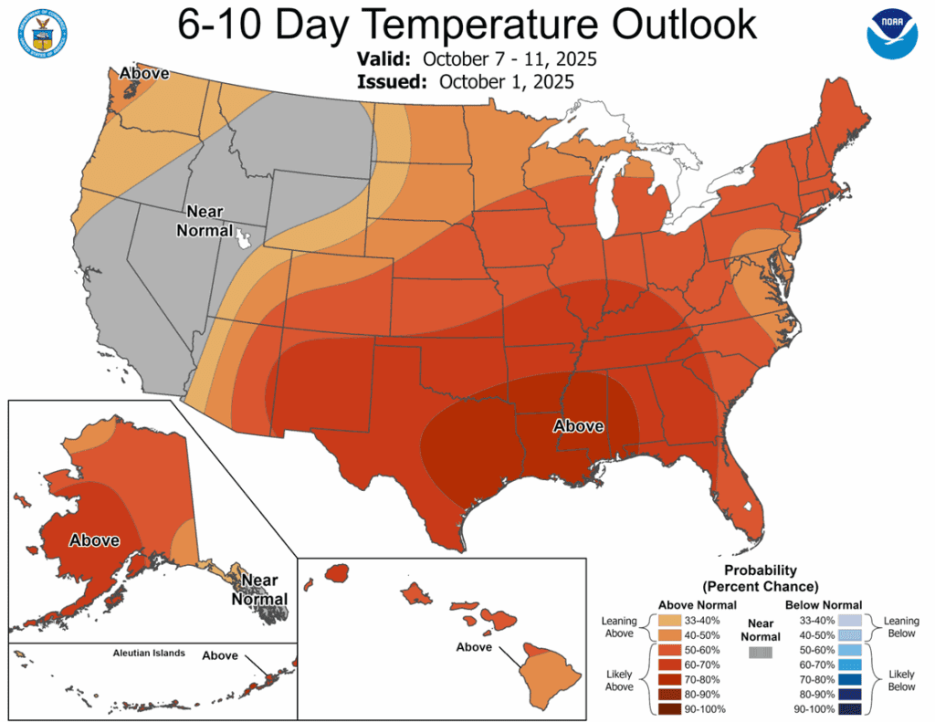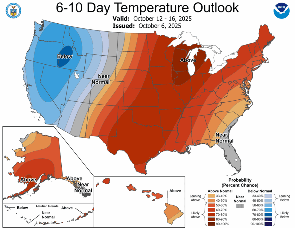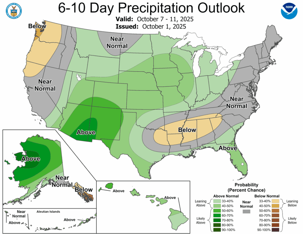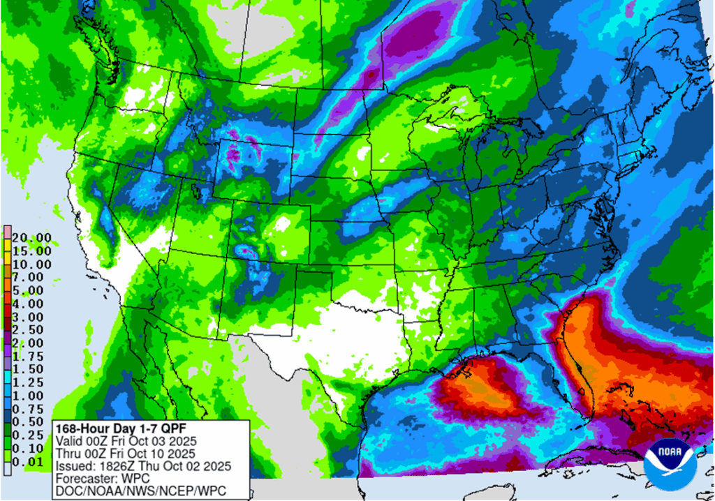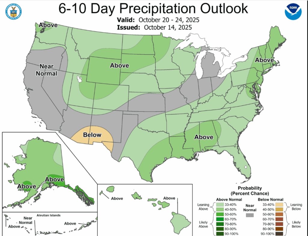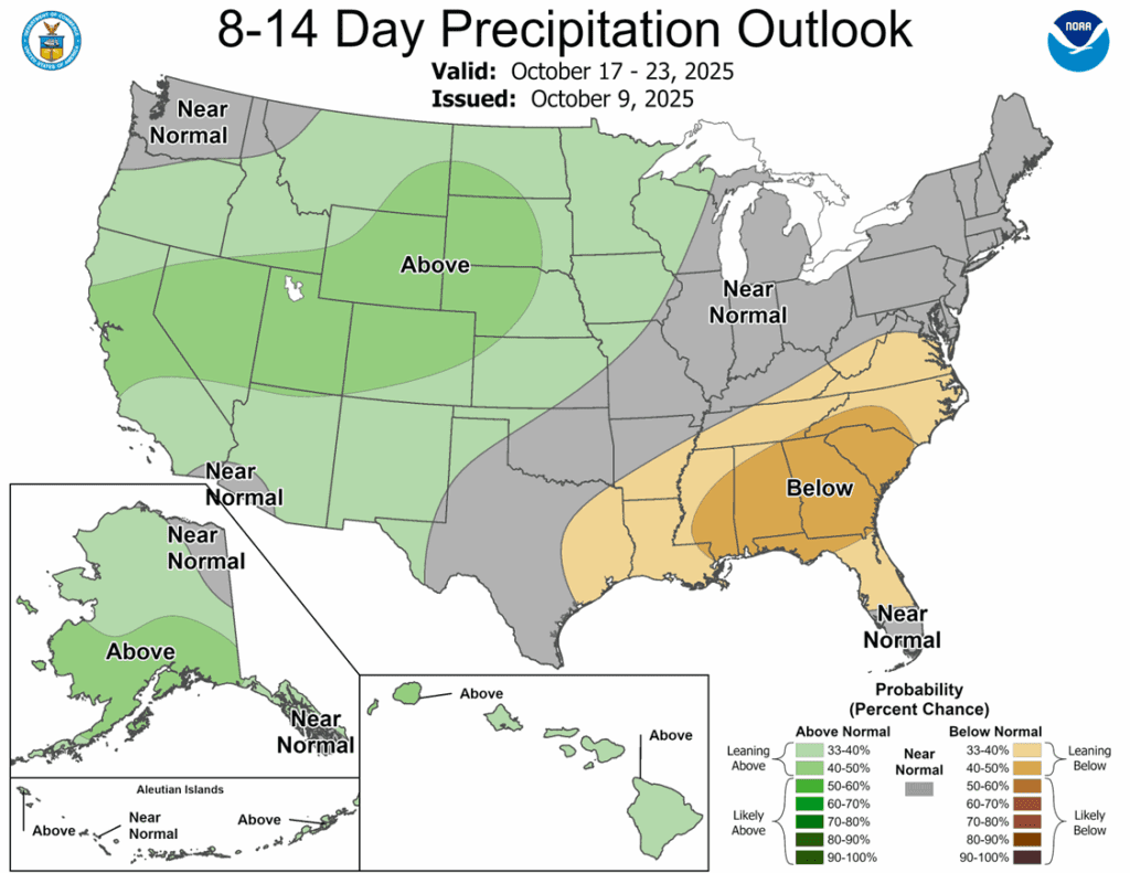 - Increased precipitation outlook into the end of the month may slow corn harvest. Harvest was anticipated to be 44% complete and with good export demand, should help support the cash market.