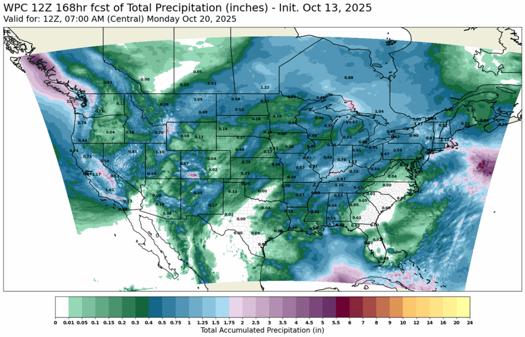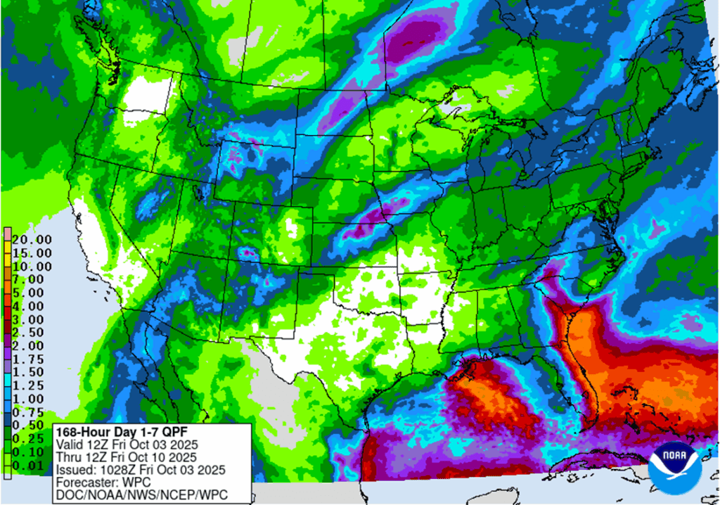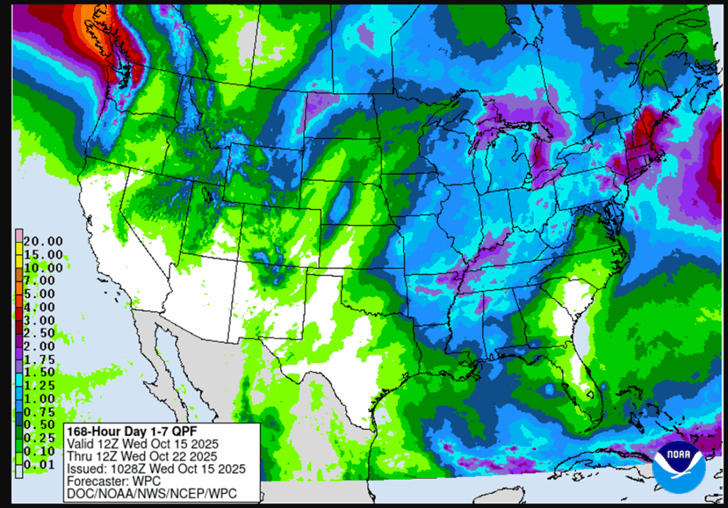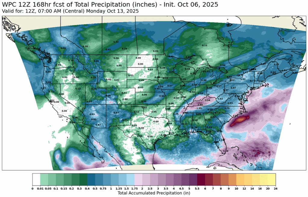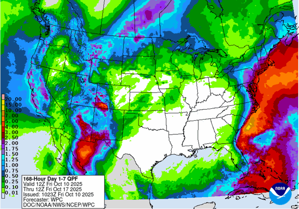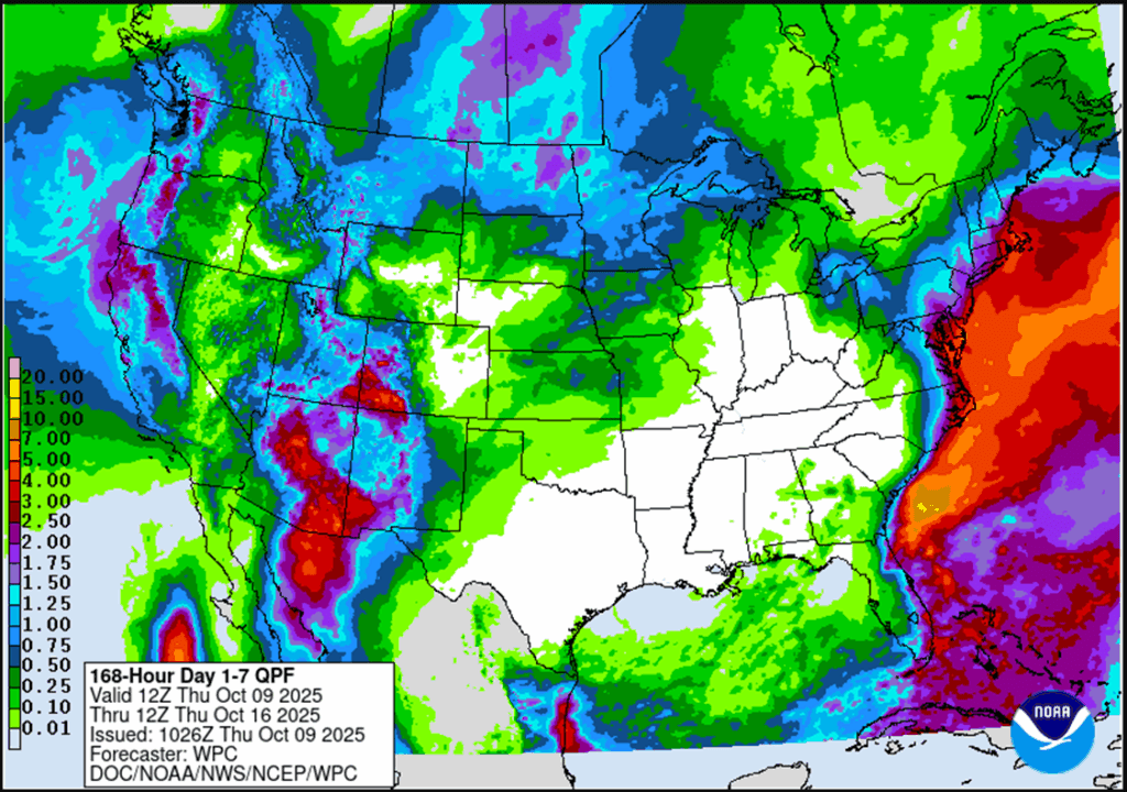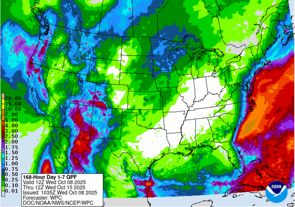 Above: US 7-day precipitation forecast courtesy of NOAA, Weather Prediction Center.