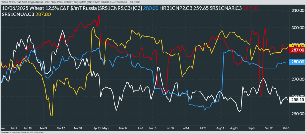 - Russia has reportedly restarted exports of wheat to Indonesia, after a 9-month hiatus. Indonesia is said to have renewed quarantine certificates to allow the imports of 52,000 mt in October. For reference, Indonesia imported 1.3 mmt of Russian wheat in 2024, compared with 123,000 mt so far this year.