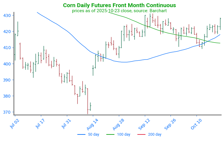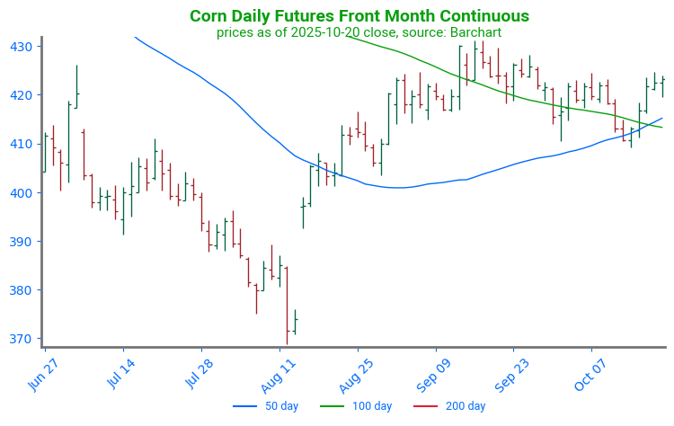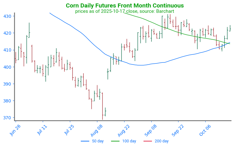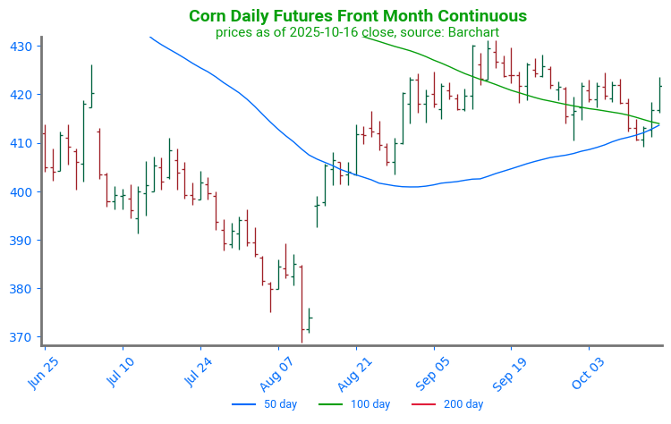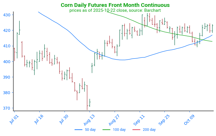 - Corn futures are trading lower to start the day but have worked off their overnight lows and may post gains on the day. December corn is down 2-1/2 cents to $4.31-3/4 while March is down 2-3/4 to $4.44-3/4.