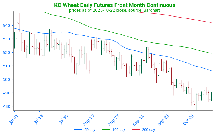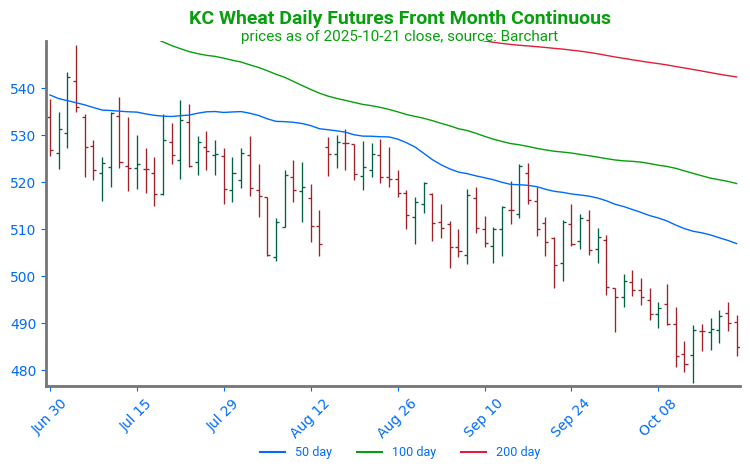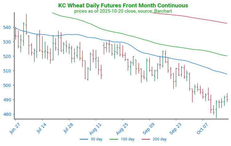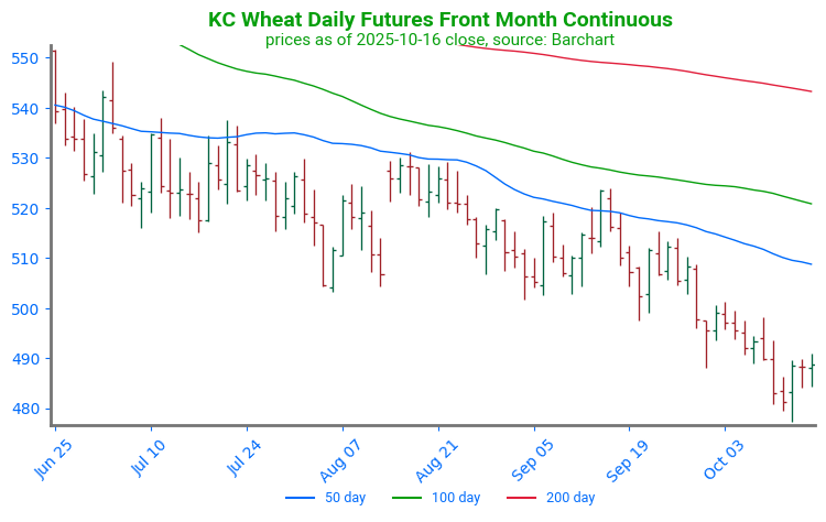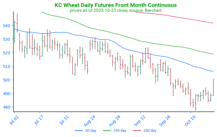 KC Wheat Continues Higher, Approaches Resistance: KC wheat has trended higher following a strong daily reversal on October 14. Prices have since managed to break through technical resistance at the 50 and 100-day moving averages and are approaching structural resistance from a previous consolidation phase, near 529. Support can be found at the 100-day moving average, near 517.