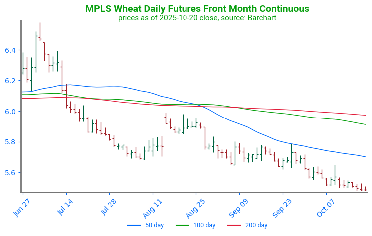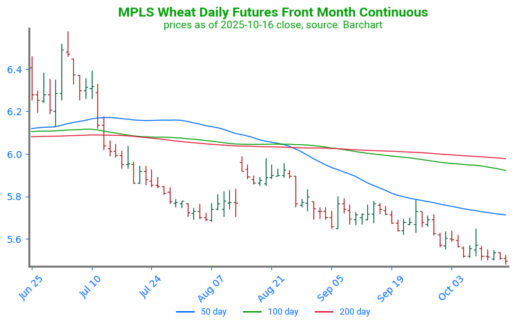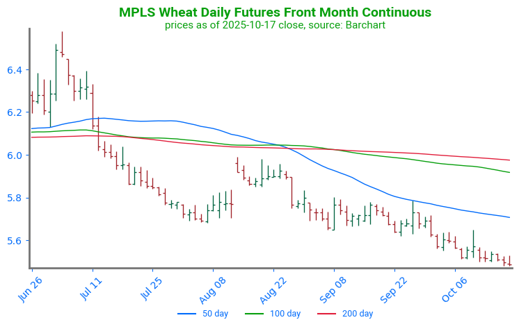 - All three wheat classes are trading lower but have come back from overnight lows. December Chicago wheat is down 5 cents to $5.27-1/4, KC is down 6-3/4 to $5.16, and Minn wheat is down 3 cents to $5.57-1/2.