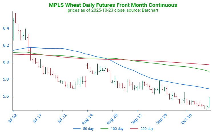 Spring Wheat Builds Momentum, Tests Resistance: Spring wheat futures found support near 545 and reversed higher with enough momentum to begin retesting resistance at the 50-day moving average, near 566. Prices have not yet been successful in breaking through this level. A second point of resistance can be found at the 100-day moving average, near 586. Support lies below at 545.