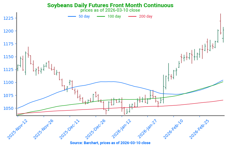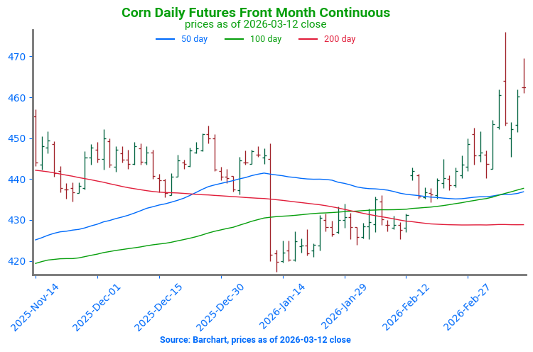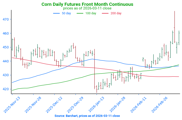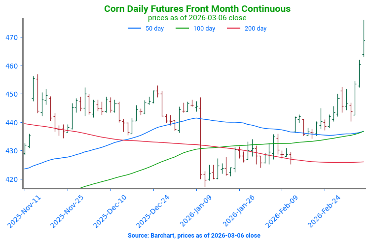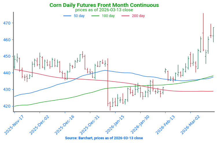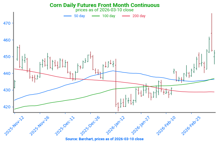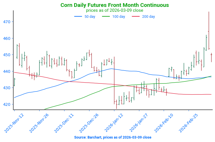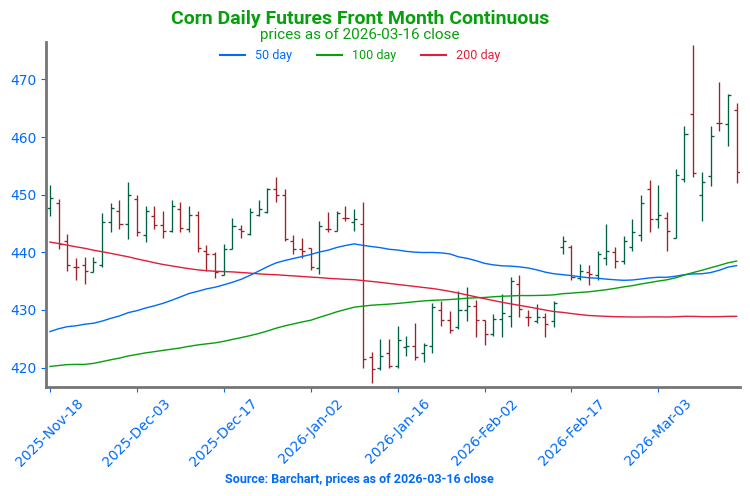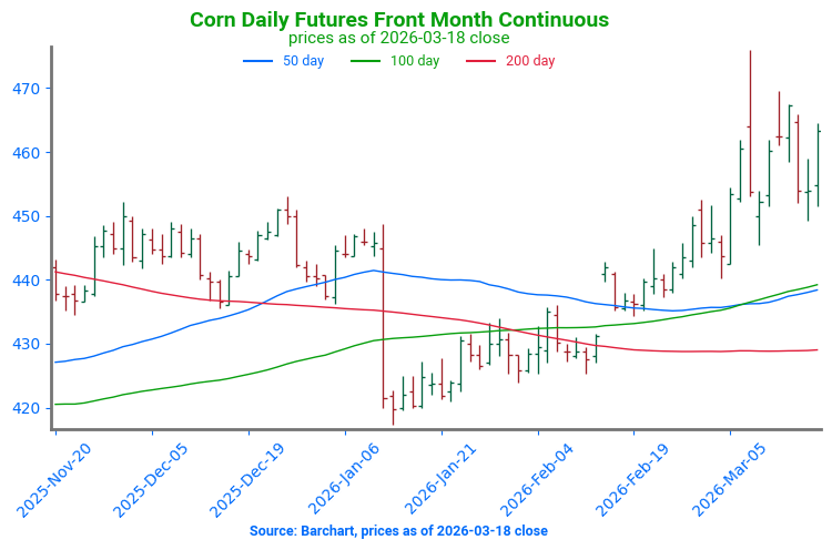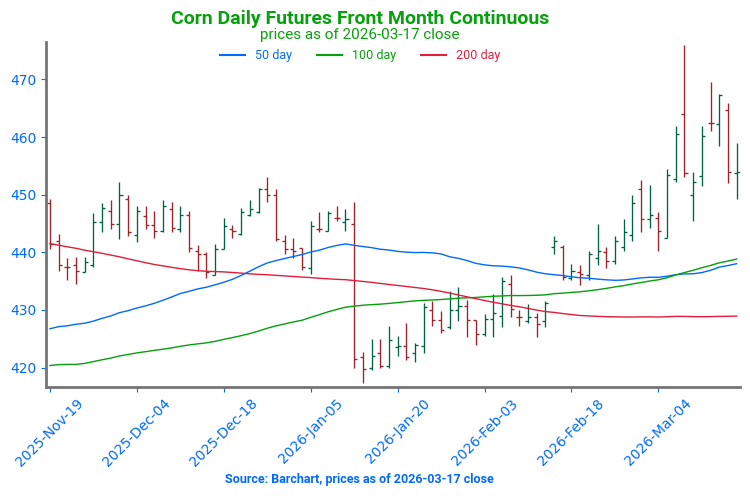 Corn Breaks Above 450: Corn futures have continued pressing higher after recently breaking through resistance near 450. That level now transitions into initial support, with secondary support found at a band of moving averages near 436. Overhead resistance is located near 495, marking the April 2025 high.