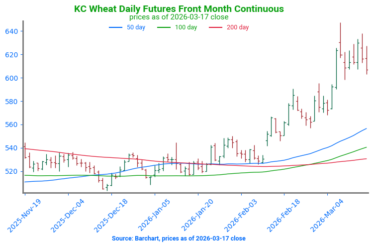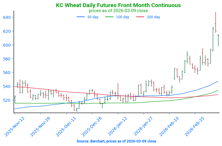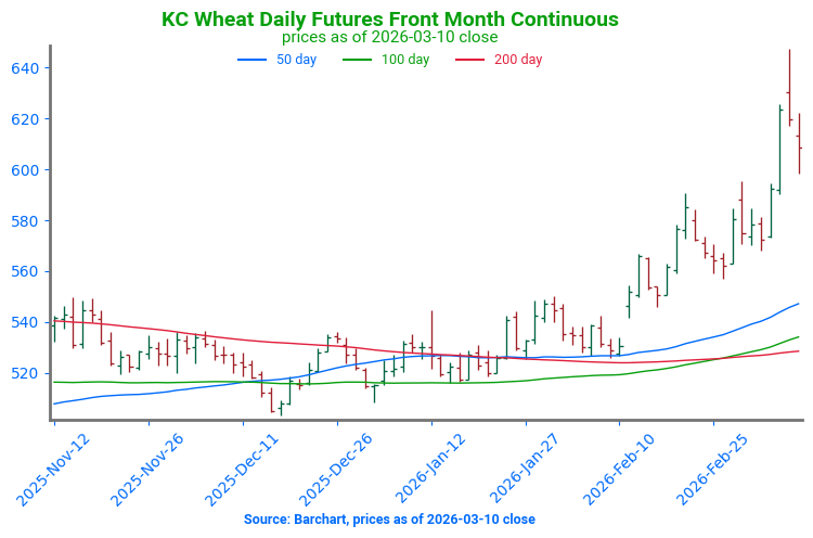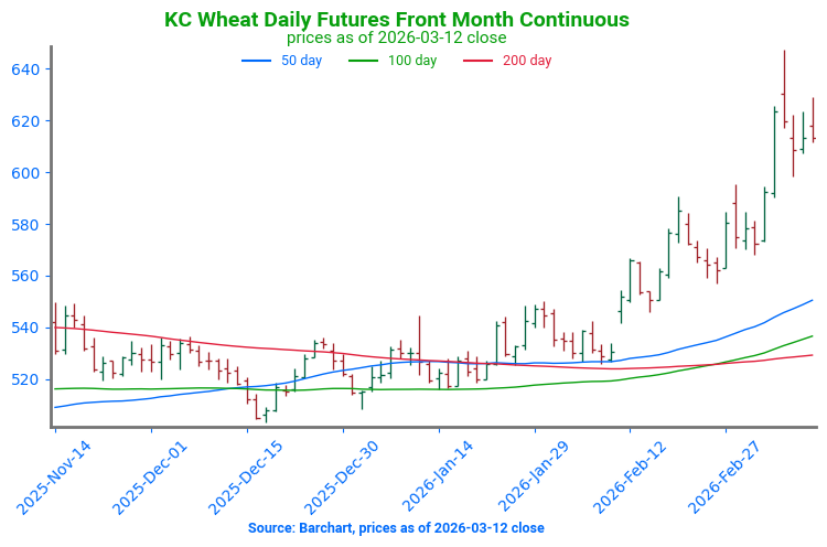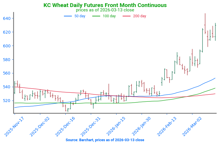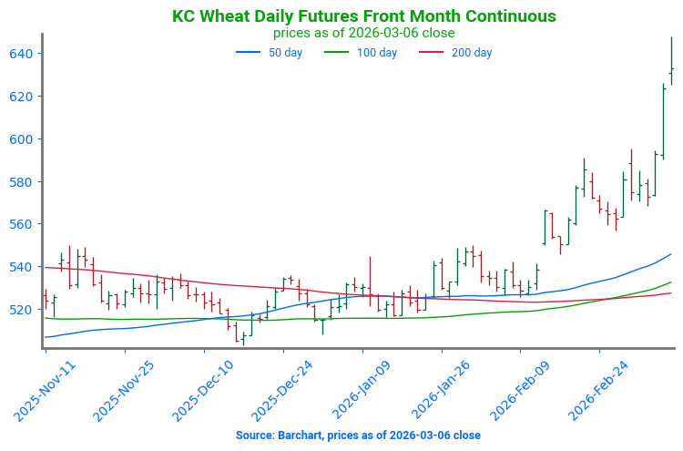KC Wheat Tests 640: Kansas City wheat futures have continued pressing higher in recent sessions, with prices now challenging structural resistance near 640, tied to the February 2025 high. Chart support is located underneath the market near 557.
