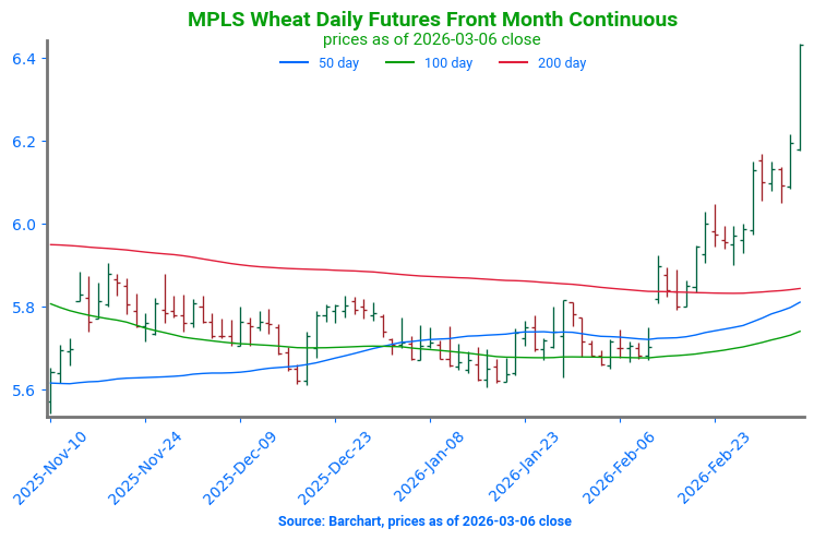 - All three wheat classes are trading higher to start the day with May Chicago wheat up 9-3/4 cents to $6.14, KC wheat up 6-3/4 cents to $6.32-3/4, and Minn wheat up 8-3/4 cents to $6.46 as fund money flows into commodities.