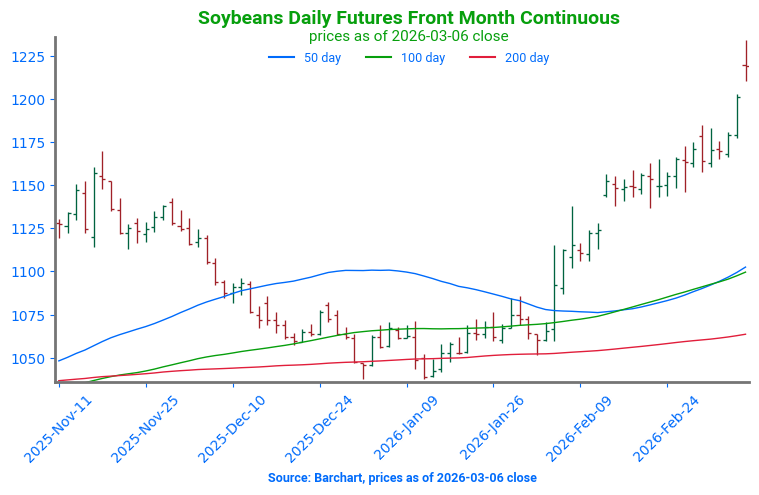 - Soybeans are trading higher this morning with support from higher crude and higher soybean meal, and gains are primarily in the back months. May soybeans are up 5 cents to $11.6-3/4 while November is up 9-3/4 cents to $11.51-1/4. May soybean meal is up $5.60 to $327.20 and soybean oil is up 0.17 cents to 65.69 cents.