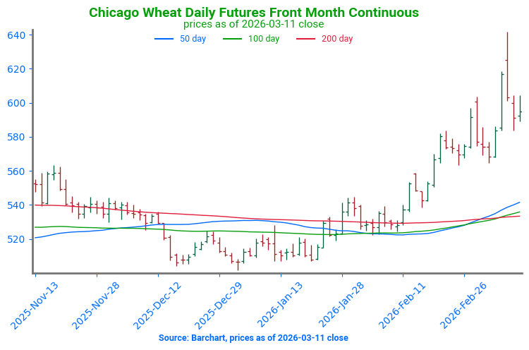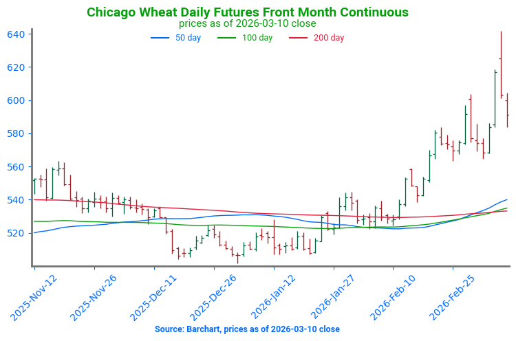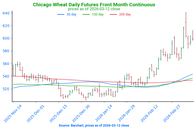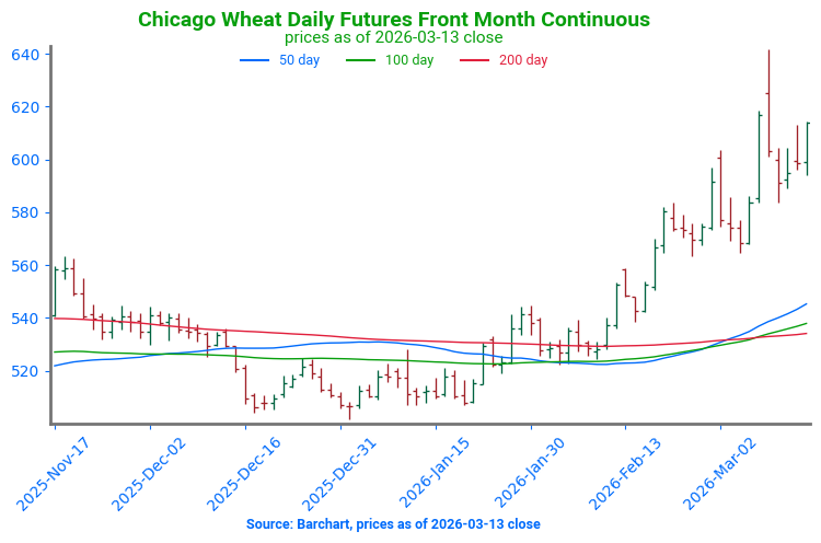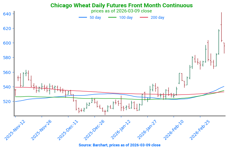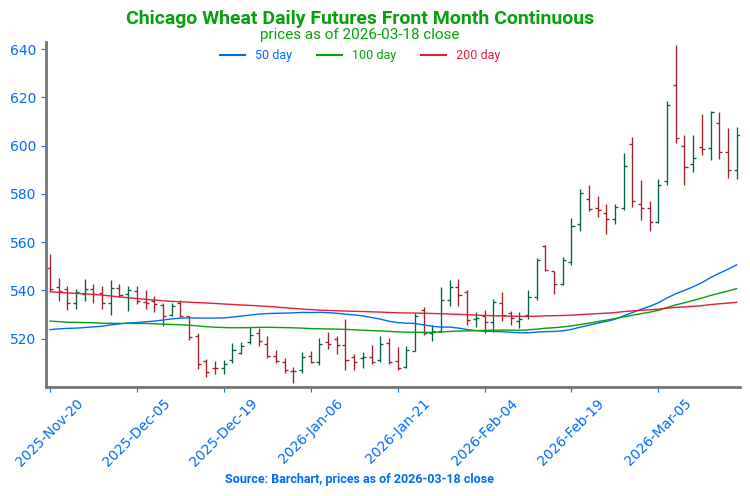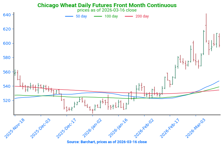 Chicago Wheat Extends Rally: Chicago wheat futures have continued their upward momentum in recent sessions, breaking above the June 2025 high near 594. Prices are now testing resistance near 620, tied to the February 2025 high. Chart support is located underneath the market near 566.