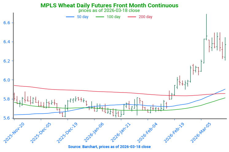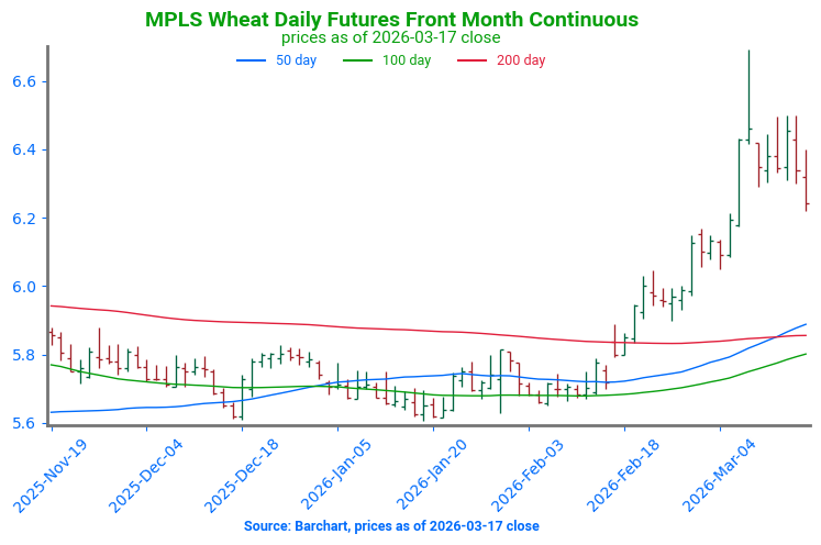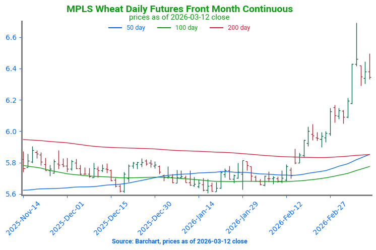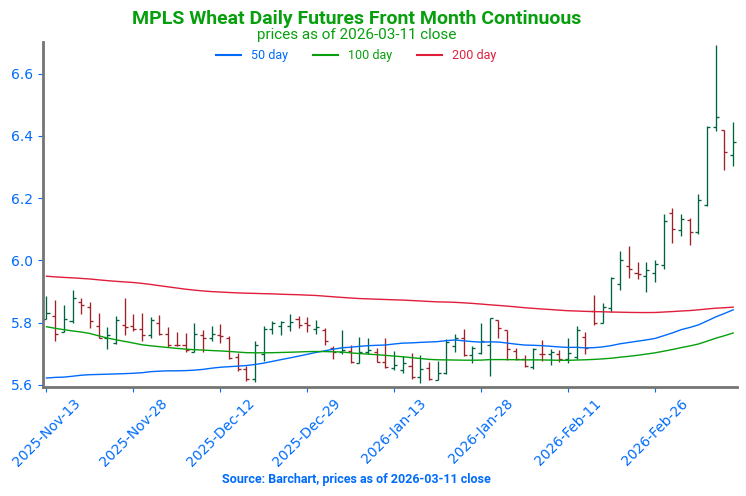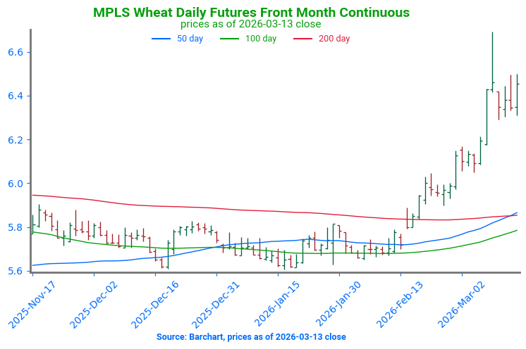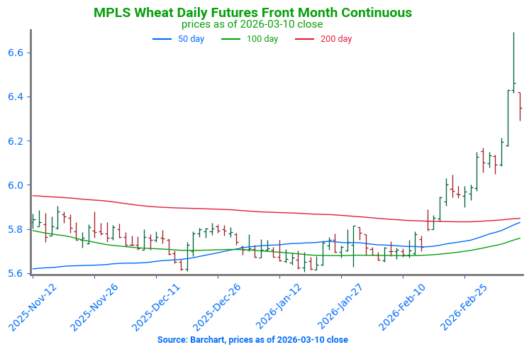 Spring Wheat Tests 650: Minneapolis wheat futures have continued surging higher, with prices now challenging structural resistance near 650. A break above this level would expose the next resistance area near 767, while chart support is located underneath the market near 605.